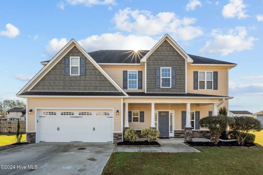 110 Pembury Way in Richlands is a spacious home offering over 2,400 square feet of living space. This welcoming property features 4 bedrooms and 2 1/2 bathrooms, providing ample room for a growing family or those who love to entertain. This home includes several welcoming spaces, such as a formal dining room, an additional den, and a large living room, making it ideal for both everyday living and hosting guests. The oversized primary owners' suite is a standout feature, complete with an fully equipped ensuite bathroom. Out back, you'll find a large fenced yard, offering plenty of space for outdoor activities, pets, or relaxation. The covered front porch adds curb appeal. Conveniently located near military bases, shopping centers, and entertainment options, this home is perfectly situated for those seeking both tranquility and accessibility to essential amenities. Don't miss out on your opportunity, come see it today!