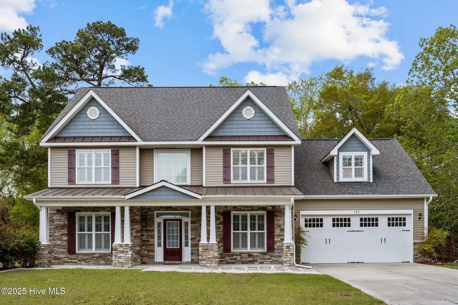 Situated on just over an acre on a cul-de-sac lot, this home is conveniently located to Camp Lejeune, with easy access to shopping and dining, and just minutes to the beach! The spruced up landscaping, and covered front porch create instant curb appeal, Inside, the two story foyer welcomes you into the home, where you will find the formal dining room to the right, which flows directly into the butlers pantry, perfect for extra storage or serving space. The kitchen features a center island, double oven, and open sight lines to the living area, perfect for entertaining. The living room is anchored by an electric fireplace, adding warmth and comfort. The laundry room and half bath also complete the first floor. Upstairs to the left is the spacious master bedroom with private ensuite complete with dual vanities, large soaking tub, separate shower and walk in closet. Down the hall are three other bedrooms and full bathroom. The bonus room offers a versatile space ready to adapt to your needs--home office, play room, guest room, media room, etc. The possibilities are endless! Don't miss the walk in attic space! Escape out back to the expansive, fully fenced in yard with plenty of room for gardening, play, entertaining, or relaxing. The detached 12 x 24 building is perfect for storage of all the toys! Notable features include large driveway, plantation blinds, custom shelving in master bathroom and closet, gutter guards, and fresh paint. Schedule your showing today and fall in love!