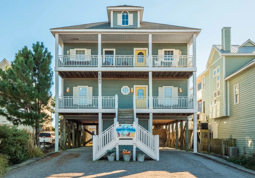 Welcome to 4388 Island Drive! This oceanfront home offers the ultimate in coastal luxury and relaxation. Perfectly situated on a prime stretch of North Topsail Beach, this residence features direct private boardwalk access to the beach, panoramic ocean views, and an array of high-end features ideal for year-round living, a second home retreat, and has a history of strong rental income generation. This spacious 5-bedroom, 5.5-bath home boasts an open-concept top floor with a light-filled living area, formal dining space, and a fully equipped chef's kitchen. Enjoy custom wood cabinetry, ample counter space, a center island with prep sink, and access to a covered deck with views of the intracoastal waterway. The adjoining living room offers abundant room for entertaining and seamlessly flows to an expansive oceanfront deck. The elegant primary suite is also located on this floor with private ocean-view deck access, and a spa-like ensuite bath featuring a jetted tub, walk-in shower, and dual vanities. The second level includes a cozy den and four additional bedrooms, each featuring ensuite bathrooms. A full laundry room and convenient access to the new hot tub are also located on this level. Additional amenities include a private elevator to all floors, an outdoor shower, covered parking for four vehicles, and a wide driveway for entertaining your guests. This turnkey property combines refined coastal style with thoughtful design and is ideal for use as a full-time residence, vacation home, and has a history as a high-performing short-term rental.