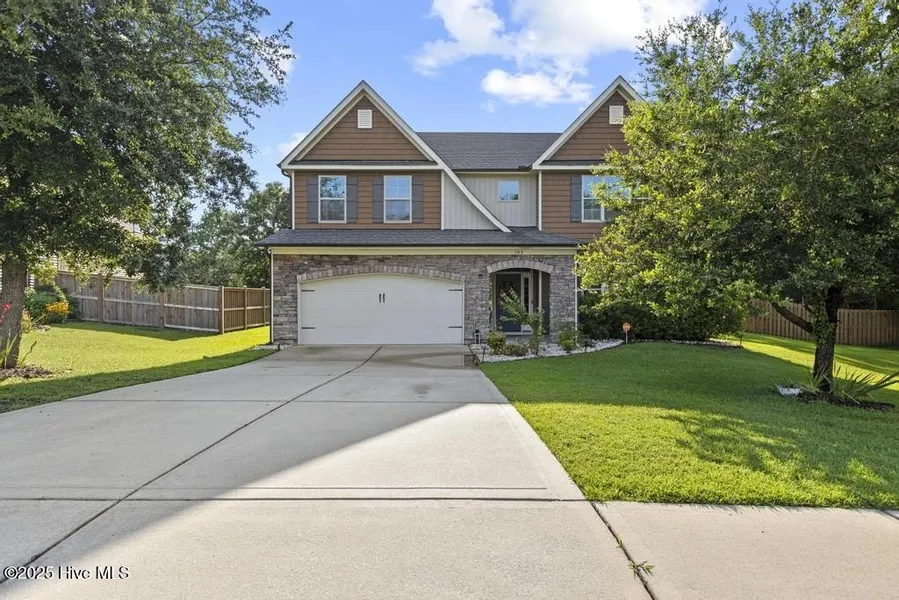 Welcome to 109 Creek End Court, a spacious 5-bedroom, 3-bathroom home situated on 1.14 acres in the highly sought-after Halls Creek North community. This move-in ready home offers a thoughtful layout, recent upgrades, and generous indoor and outdoor living spaces, all just minutes from area beaches, local entertainment, and military bases. Step inside to an open floor plan featuring a dramatic two-story formal living room, a formal dining room with classic wainscoting, and a cozy living room with a gas fireplace and sleek black granite surround. The large kitchen is a standout, offering plenty of cabinetry for storage, granite countertops, a tile backsplash, stainless steel appliances, a center island, and a bright breakfast nook that flows into the living room, ideal for entertaining or everyday living. Upstairs, you'll find four spacious bedrooms, including a large owner's suite with dual walk-in closets. The en suite bath features double vanities, a soaking tub, walk-in shower, and a private water closet. Bedrooms two and three share a convenient Jack and Jill bathroom with separate vanities and a shared bath area. A first-floor bedroom with an adjacent full bath is perfect for guests or multi-generational living. Ceiling fans have been installed in every bedroom for year-round comfort. Additional upgrades include a recently installed water heater and garbage disposal, motion-detecting light in the backyard, and an RV plug-in on the side of the home. Enjoy the screened-in porch, extended patio, fenced backyard, and beautifully landscaped front yard, all offering plenty of room to relax or entertain. Don't miss your chance to own this well-maintained property with room to grow, play, and enjoy the coastal Carolina lifestyle!