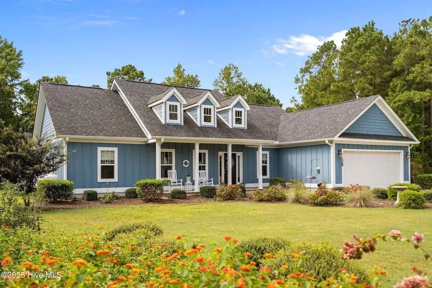 Discover timeless charm and modern elegance in this custom-built 3-bedroom, 2.5-bath residence with a bonus room and four-seasons room. This exquisite southern coastal home is perfectly positioned on a private and gracious beautifully landscaped 1.29-acre lot in the highly sought-after waterfront community of Kings Harbor in Holly Ridge. Just minutes from the sun-soaked beaches of Topsail Island, military bases, and shopping conveniences, this nearly 2,200 sq. ft. home offers the best of coastal living. A picturesque Vinca-lined walkway leads to the welcoming rocking chair front porch, setting the stage for the refined interiors within. Inside, vaulted ceilings crown the light-filled living area, where custom built-ins frame a cozy propane fireplace. The open-concept design seamlessly connects to the chef's kitchen, showcasing quartz countertops, a stainless steel 50/50 sink with Moen faucet, elegant tile backsplash, Whirlpool stainless steel appliances, crown molding, recessed lighting, and soft-close cabinetry. An island with a breakfast bar illuminated by pendant lighting makes entertaining effortless. The adjoining dining area opens through glass sliders to the four-seasons room, drenched in natural light from oversized 46x55in windows overlooking the backyard. The split floor plan ensures privacy, with the owner's suite featuring tray ceilings, dual walk-in closets with wood shelving, and a spa-inspired ensuite. Indulge in separate elevated vanities with quartz countertops, a soaking tub with tile surround, and a separate glass-enclosed tile shower. On the opposite wing, two guest bedrooms share a Jack-and-Jill bath complete with dual elevated and separate vanities, Delta faucet, quartz counters, and designer tile finishes. Additional highlights include a versatile flex room, spacious laundry with abundant cabinetry, and elegant wood flooring throughout accented by custom Roman shades.