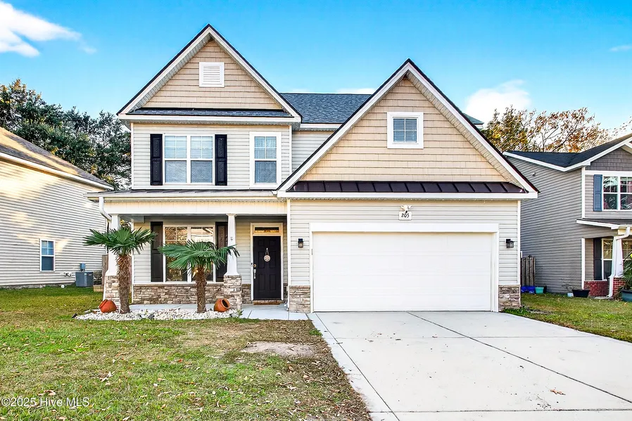Just in time for the Holiday's!! Welcome home to this established neighborhood at Peggy's South Bridge. This stunning home is a rare find with 5 bedrooms and the primary suite is on the first floor living area. When you walk into the foyer you have built in storage for your convenience. Off the foyer is the laundry room on the right and a formal dining room with coffered ceilings on the left. Through that room is a stunning recently remodeled Kitchen. New Quartz Counter Tops. New Tile backsplash, New Stainless undermount sink and cabinet hardware freshly painted cabinets, under counter dimmable lighting with Stainless Steel Appliances. and New Lighting fixtures Recently Updated LVP seamless flooring downstairs except the primary suite. The living area is spacious with nice high ceilings, electric fireplace with craftsmen wood work and shiplap. The best part is the primary living suite is...