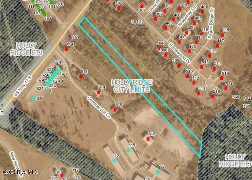 Two, 2.5 acre tracts, side by side zoned commercial that are available to be purchased together as a package deal for a total of 5 acres with over 150 ft of road frontage on Hwy 17 in the heart of Holly Ridge. See adjoining parcel listing. Buyer to confirm school district and zoning with Holly Ridge.