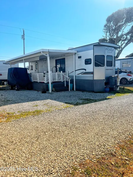 Adorable, newer camper with fabulous attached covered porch. 1 bedroom with nice front kitchen. Really nice lot has room for truck and/golfcart. Nice Street close to the right front entrance and grill. Golf cart negotiable.