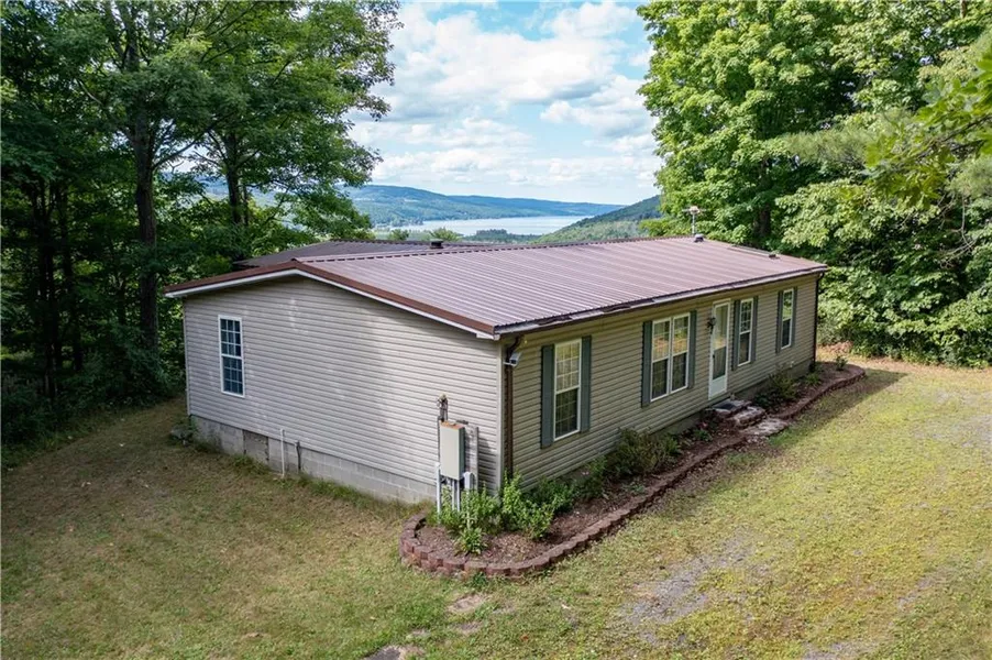 A piece of paradise. This 1323 square foot, 3-bedroom 2 bath modular home sits on 5.51 acres of rolling trees and hiking trails that overlooks Canandaigua Lake. The view can be seen inside the house or on either the back deck or side deck. This house comes FULLY FURNISHED with the exception of seller removing a few personal items. The roof is 2012, porch 2012, new carpets. Furnace was replaced 6 years ago, pole barn is 24x26 with electric, washer and dryer hookup is available but there are not a washer and dryer in the house. All tools in the barn will be left as well as the lawn mower. The private road where the home sits is shared with 6 other homes and is privately plowed in the winter. The cost to each person for the winter year is approximately $350. Propane is bought in bulk and is approximately $1000 to heat the house. The tank is buried behind the pole barn. Open House Sunday 7/31 from 3:30-5pm
