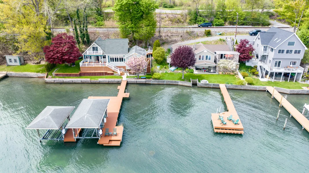 Rare opportunity to own two adjacent superb waterfront properties. One large three bedroom / two bath and another two bedroom / one bath home with 196’ of combined waterline frontage with 6’ sea wall. Two large docks offer plenty of space to relax and entertain, two lifts setup for up to a 40’ vessel and a tri-toon pontoon boat. Play yard games, BBQ or enjoy the fire pits in the private level lawn space. Dining areas in both have direct access to the large decks for indoor/outdoor living. Living rooms have large windows to take in the extraordinary lake views and breezes. Lakeside bedrooms have balconies and decks as well to enjoy a morning coffee or evening glass of wine. Both properties have high efficiency natural gas HVAC systems and central AC, and public water. Minutes from downtown Geneva , the Seneca wine trail and the rest of what the Finger Lakes region has to offer. A must see!