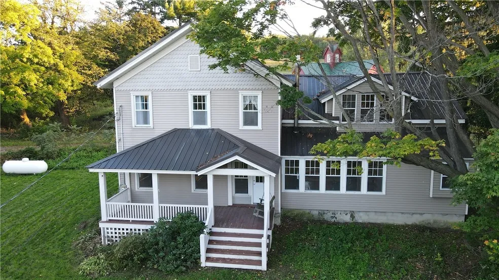 Step into history with this beautifully preserved 1850s farmhouse with a spacious 2,813 sqft boasting 3 bedrooms and 3 full bathrooms. Inside you will find a touch of farmhouse elegance, like rustic sliding barn doors, exposed wooden beams, plank floors, and rich wood trim throughout. The heart of the home is the expansive country kitchen, featuring a massive center island and an adjoining dining room perfect for family gatherings. A generous mud room and first-floor laundry room is convenient for busy lifestyles. The attached two-car garage and additional carport provide plenty of storage for vehicles and equipment. Newer mechanicals throughout, the house has been converted to new propane stoves providing warm heat with a wood-stove glow. This well maintained house sits on an expansive 30.4 acres of lush pasture land. The property includes two large barns one with two horse stalls, and a vast hay loft. A second large barn sits up the hill slightly ideal for additional livestock, extra storage or workshops.