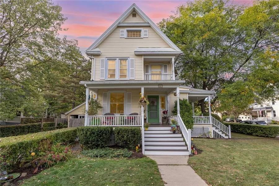 Welcome home to this beautifully maintained 4-bedroom, 2-bath gem in the heart of Canandaigua! Built in 1890, this charming home offers historic character without the restrictions of a historic designation. Sitting proudly on a corner lot on a quiet side street, you'll love being just minutes from all the shops, restaurants, and attractions downtown has to offer. Inside, you'll find over 2,000 square feet of living space with plenty of room to spread out. The large, newly renovated kitchen with island is perfect for gatherings, while three cozy covered porches invite you to relax with your morning coffee or evening book. With central air, two furnaces (one for each level), and thoughtful updates throughout, comfort is built right in. Looking for flexibility? There's potential for a first-floor bedroom, and this home can also be easily converted back to a two-family residence with very little work. Whether you're searching for space, convenience, or a home filled with character, this Canandaigua treasure has it all! Don't wait- schedule a showing today! Mackenzie Childs Light Switch Plates, house number on front of house, and towel holder in downstairs bathroom do NOT convey with the property. Fireplace is NOT a working fireplace. Public Twilight Open House - Thursday, October 9th 5:30-7:00. Public Family Open House -Check out the AMAZING kitchen and 4-5 bedrooms Monday, October 13 10:00 - 11:30.