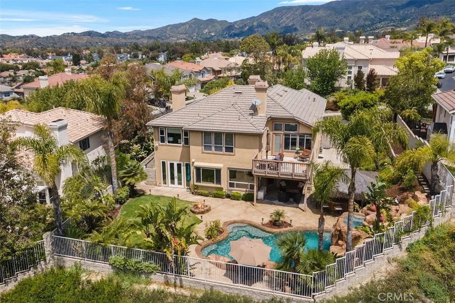 Entertainer's paradise behind the gates of exclusive Walden, a highly sought after community tucked into the foothills of Trabuco Canyon. This opulent 5-bedroom residence combines elegance with joie de vivre, with spectacular resort-inspired grounds on a private, oversized 10,600+sf view lot situated on a single-loaded culdesac. Through the stately double-door entry, you'll find gorgeous hardwood floors, a formal living room with fireplace, dining room with new French doors, an updated chef's island kitchen with granite counters, soft-close cabinetry and newer appliances opens to the great room, a guest suite with private en-suite bath, and a powder room. The grand staircase leads to an expansive loft, ideal for recreation, informal gatherings, movie nights, homework and more. A separate, private office with French doors has a picture window that captures the view. The sumptuous master suite is an idyllic retreat, with a dual-faced fireplace creating ambience in the bedroom & bath, and a private balcony perfect for enjoying morning coffee or evening cocktails. The spacious bath features a separate soaking tub and shower, two sinks, and a large walk-in closet in addition to the full-wall closet in the bedroom. There are also three very generously-sized secondary bedrooms on this floor, and a full bath with dual sinks. The highlight of this unique property is the magnificent rear yard, backing to a greenbelt and affording views and privacy. Make every day a luxurious getaway with a pebbled saltwater rock pool & spa with slide & multiple waterfalls, outdoor kitchen & bar beneath a charming thatched palapa, fire pit, California room with outdoor TV, tropical landscaping and a lush, expansive lawn. The bar area seats 10 easily, and features a top-of-the line DCS bbq, fridge, sink, kegerator and more. The pool deck and rock structure are newly re-painted, and an elevated spa built into the rock structure offers stunning sunset views. Convenient smart features throughout the property include outdoor cameras, internal security system with Ring and door sensors, Wifi pool interface, smart light switches and outlets, Nest thermostats, B-Hyve sprinkler system, and MyQ keyless entry garage opener. You'll enjoy Walden's private catch-and-release pond, newly updated tot lot, community pool, spa, and clubhouse. Conveniently located to all RSM has to offer, including a lake, hiking trails, shopping, dining, toll roads and more. Welcome home!