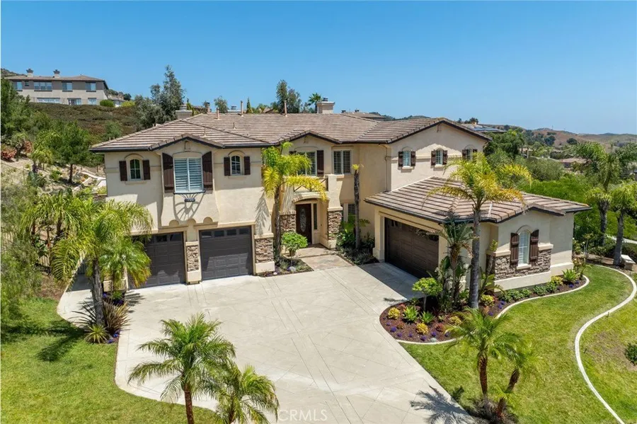 Stunning 5BD/5BA estate in prestigious Santiago Canyon Estates, set on a private single-loaded cul-de-sac with panoramic hillside views. This 4,244 sq ft home features a chef’s kitchen with dual marble and quartz islands, custom cabinetry, and top-tier stainless appliances—opening to a light-filled family room with sweeping vistas. The main level includes a grand ensuite bedroom perfect for guests or Next Gen living, a private office with fireplace, formal living and dining rooms, and dual staircases. Upstairs, the luxurious primary suite offers a fireplace, sitting area, spa-style bath, and dual walk-in closets. Across the catwalk, three additional bedrooms with views surround a spacious loft. The resort-style backyard features a pool, spa, and ocean views on clear days. With a 4-car garage, motor court, and elevated finishes throughout, this home blends timeless elegance with modern style in one of Orange County’s most desirable communities.