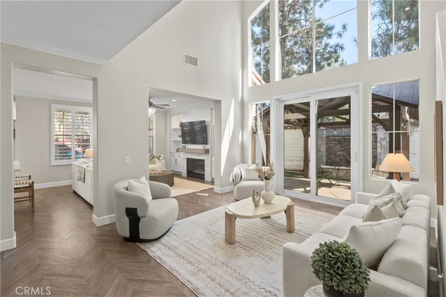 Step inside to discover a bright, open floor plan highlighted by soaring double-height ceilings and dramatic floor-to-ceiling windows that flood the space with natural light. Elegant crystal chandelier, crown molding, and plantation shutters add warmth and sophistication throughout. The newly remodeled gourmet kitchen is a chef's dream, featuring quartz countertops, six burner stove and double oven, custom cabinetry, and stylish Italian tile backsplash-perfect for both everyday living and entertaining.