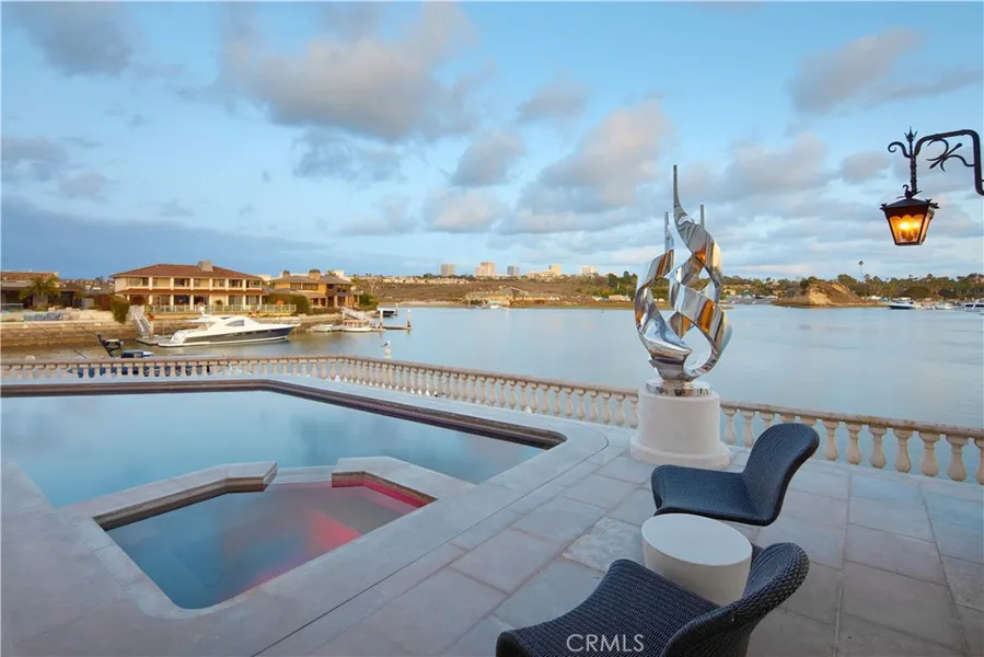 Showcasing approximately 148 feet of prime bay frontage from its exceptional end-of-cul-de-sac location in Newport Beach's prestigious Dover Shores, this extravagant custom estate elevates waterfront living. A private dock that can accommodate multiple vessels is one of the countless luxurious that are revealed at the European-style villa, which is set behind gates and hosts five en suite bedrooms and six-and-one-half baths. Approximately 6,601 square feet, the opulent residence impresses upon arrival with an open-concept main level that frames views through extensive walls of telescoping glass doors, bringing bay, marina and city-light views into living areas of genuine distinction. The living, dining, and family rooms open directly to a massive waterfront terrace with a resort-caliber pool and spa, open-air fireplace, and an outdoor kitchen with grill and bar. Bay views continue in the kitchen, which hosts an island with waterfall edges, a pass-thru to the terrace, solid stone sink, walk-in pantry, Miele coffee station, wine fridge, and a gorgeous Lacanche range with pot filler. Three bedrooms and an office are located on this level, which also features a two-vehicle garage with two lifts accommodating up to four vehicles. An elegant circular staircase leads to the second level, where a rotunda opens to a romantic Juliet balcony overlooking the entry courtyard. A plush theater with enormous screen and wet bar, a fireplace-warmed office, and an exercise room join a secondary suite upstairs. The primary suite reveals an entrance with two hand-carved doors and a cross-loin ceiling, and a vaulted ceiling soars over the bedroom. Enjoy a fireplace, deck with panoramic bay and city views, two boutique-inspired walk-in closets, a solid stone freestanding tub, oversized multi-head steam shower, sit-down vanity and two sinks overlooking the bay. Additional highlights include lighting and alarm systems, custom shades, and built-in audio. Your desirable address in Dover Shores places you merely moments from community parks, Back Bay trails and the Newport Aquatic Center. Westcliff Plaza, Fashion Island, and miles of beaches are minutes from home, and a variety of award-winning public and private schools serve all grade levels. Rarely available, this extraordinary estate offers the unparalleled waterfront lifestyle you've been seeking.