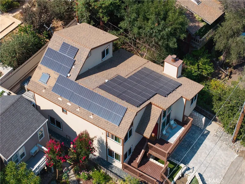 WELCOME TO YOUR ENERGY INDEPENDANT DREAM RETREAT! This stunning 3-bedroom, 2-bathroom canyon home has the ability to produce most of its own power. The system that includes 27 solar panels and 2 battery power banks and 4 inverters. In September the system produced 722 kWh. Nestled in a picturesque setting with panoramic canyon views, this property is a true sanctuary for nature lovers and outdoor enthusiasts alike. Inside, the thoughtfully designed floor plan features two spacious bedrooms and a full bathroom on the lower level-perfect for guests, family, or a home office setup. Upstairs, you'll find a private and expansive primary suite that serves as a luxurious escape. The suite includes a separate room with a walk-in closet, laundry room and wash tub for added convenience, and an upgraded spa-inspired bathroom with a large upgraded shower and dual 'his-and-her' vanities. The inviting living room boasts a cozy wood-burning fireplace, while the upgraded kitchen is equipped with sleek quartz countertops, premium appliances, designer cabinets, a wine refrigerator, and opens to a stylish wet bar-ideal for entertaining. Wrapped in durable, upgraded Hardie board siding and finished with fresh exterior paint, the home radiates curb appeal. Energy-efficient solar panels and a state-of-the-art home battery backup system provide self-sufficiency and year-round peace of mind. An attached 2-car garage offers ample storage, and the surrounding natural landscape completes this peaceful setting. This is more than just a home-it's a self-sustaining canyon oasis designed for comfort, style, and everyday adventure. Located on the prestigious Olive Hill, this home is adjacent to both Tucker Wildlife Sanctuary and the popular Harding Truck Trail for both hiking and mountain biking. The tightly knit community of Modjeska Canyon offers lots of events throughout the year to bring the community together making it a unique and special place to call home. Don't miss the opportunity to own this exceptional canyon retreat.