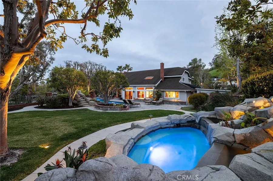 Enjoy a rare combination of resort-style living and prime cul-de-sac location at this highly upgraded, equestrian-zoned home in Nellie Gail Ranch. Situated on a 0.65-acre flat, usable lot surrounded with mountain and hillside views, this turnkey property is designed inside and out for the ultimate in relaxation and entertaining. Inside, over 4,000 sq ft of light-filled living space features grand proportions and thoughtful updates. The main level welcomes with travertine floors and a foyer that flows into the living room with vaulted two-story ceilings, skylights, and a floor-to-ceiling fireplace. Modern accents are featured throughout, from custom lighting and chandeliers to electronic shades, with a wall of windows and sliding doors connecting living spaces to the backyard. The remodeled kitchen showcases custom cabinetry, quartz countertops, tile backsplash, stainless appliances (including double wall ovens and built-in Miele coffee/espresso machine), and opens to both formal and casual eat-in dining spaces. The family room features a second fireplace and a built-in bar, while multiple access points seamlessly transition outdoors. A main-level bedroom suite with a private bath and backyard views, a flexible office or bedroom, and laundry with upgraded front-loaders complete this level. Upstairs, the primary suite is a private retreat with vaulted ceilings, skylights, sitting area with fireplace, and a renovated spa-like bath featuring a jacuzzi tub, dual vanity, and oversized walk-in shower. Also upstairs are a loft space and built-in office area, two secondary bedrooms (one with extensive built-ins and Murphy bed), and an updated full bath with double sinks and frameless shower/tub. Outside, the backyard is an entertainer’s dream with a saltwater pool, spa and slide, and a custom oversized jacuzzi with room for 12; extensive stone patio hardscaping; spacious lawn and mature landscaping; three large, terraced planters ideal for gardening or growing your own food; side fountain; sport court; storage shed; plus a walking path around the perimeter. Enjoy everyday comfort and peace of mind with newer upgrades including pool refinishing with gunite, new tile and PebbleTec; full-house PEX repiping; dual HVAC systems with full-house fan; tankless water heater; metal roof with 50-yr warranty; dual-pane Low-E windows and doors; ELK security system and more. Experience indoor-outdoor luxury living at its best in one of OC’s most sought-after neighborhoods.