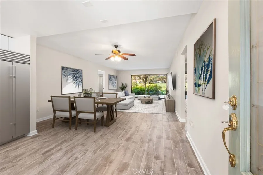 Welcome to Sunshine and Fairways on the El Niguel Golf Course. As you walk in the front door you will be captivated by the stunning views of the fairways and beyond. The home has been remodeled to be open and inviting. Wood like tile floors run throughout the home. The kitchen has quartzite counters with modern cabinets. The primary bedroom has views and private access to the covered patio as well as a private bath. One of the secondary bedrooms also has outside access and views. All 3 bedrooms are large with great storage. Off the great room is an oversized covered outdoor space and patio. Off the patio is a private laundry room. The property has a XL oversized 2 car garage, detached, but very close. The HOA includes water and trash as well as many amenities. You can enjoy the sparkling pool and spa, BBQ and picnic areas within the East Nine community. You can venture out and explore th...