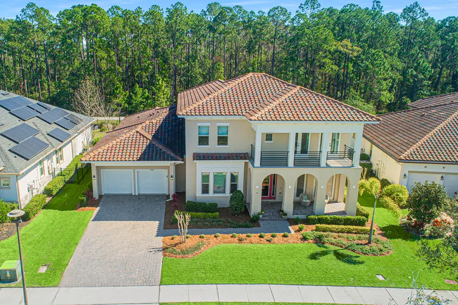 Rare conservation lot with space for a large pool. This amazing home has beautiful curb appeal, manicured landscaping, a custom outdoor kitchen and a picturesque front porch to enjoy. Surrounded by private, wooded views this luxurious two-story Mediterranean gem features five bedrooms, five and one-half baths all within 4,845 square feet. This well-appointed home boasts a lengthy list of amenities, including beautiful hardwood flooring throughout the main floor living, crown molding, volume ceilings, an in-wall pest guard system and stunning energy-efficient windows throughout. As you enter you are greeted by the formal living room that can transition into your home office. An en-suite bedroom is positioned at the front of the home that accesses the porch via double French door access. The modern, open kitchen is equipped with High-End GE Monogram appliances, granite countertops, espresso cabinets, an island with a breakfast bar and more counter space than you can imagine. A cozy dining space opens to the family room with volume ceilings where lots of natural light flows into the home creating the perfect space for entertaining. The master suite is a private oasis on the left-wing of the home. The master bath has a large, tiled shower, dual vanities, a toilet closet and a walk-in closet lined with custom built-in shelves and connects to the laundry room with cabinets and sink. The second floor hosts a bonus room perfect for watching movies or setting up game tables for fun. Three additional bedrooms, two en-suite and one with a large balcony that is nice for a private space to unwind and watch the Florida sunsets. A sanctuary among the beautiful greenery, the outdoor living area boasts an automated screened covered lanai, summer kitchen with grill, sink and fridge with ample deck space to BBQ on weekends and enjoy the Florida weather with family and friends. The yard is large enough to add a pool. Truly a home to enjoy making memories with your growing family plus the community has wonderful amenities including an aquatic center, fitness center, community gardens, dog park, playgrounds, walking/biking trails, and a lake house event venue. Great schools, shopping, and dining. Near many golf courses and lakes for the outdoor enthusiasts and weekend activities. One-year home warranty is provided. Make your appointment today this home will check all your buyer's boxes.