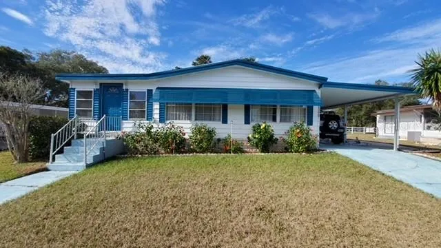 GOLF COMMUNITY - 55+ Community - Welcome home to this quaint 24 hour gated community. Outside you notice this wide manufactured home with attached carport, covered workshop with AC under the carport, manicured landscaping, complete exterior repaint, and the lawn has irrigation. This home is a 2 bedroom / 2 full bathroom, 1,600 + Square Feet of Living space, hardwood floors throughout, move-in ready, clean, outside laundry room, plenty of prep space and storage in the kitchen and a large master bathroom. **NEW ROOF**. Not only is this home ready, but the community is also ready to explore the tennis courts, pool, 2 fishing docs, golfing on the 72 par championship golf course, driving range, pro shop, heated spa, cornhole, pickleball, fitness center, shuffleboard, horseshoes, free bus transportation for grocery and shopping. Nearby you have good schools, parks, Wekiwa state park, rock springs state park, other natural springs, Apopka airport, lake Apopka, boating, restaurants, entertainment, major roadways and more. Come settle into the welcoming community and have so much fun and relaxation. Call us today!