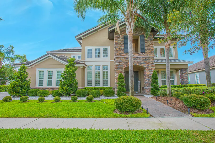 Breathtaking backdrop and perfectly positioned along the shores of beautiful Lake Hancock. This majestic estate rests on over 1.5 acres with 110 feet of water frontage. It is truly a sight to behold with its elevated lake view. It is the best lot in the community. The ultimate escape for the outdoor enthusiast, this home has been custom designed and underwent an extensive renovation and expansion throughout the last year. The floor plan is fantastic. Upon this grand entrance, you'll find a bright two-story foyer with floor-to-ceiling windows in the living room, along with an office and a climate-controlled wine room. The interior spans almost 5,700 square feet with five large bedrooms, seven baths, office, loft and home theater. A bright and airy family room/kitchen combination with sliding doors that allows direct access to the lanai. The gourmet kitchen is perfect for entertaining with top-of-the-line finishes and stainless steel appliances, a large prep island and a roomy walk-in pantry. The master suite is downstairs with a luxurious master bath featuring dual sinks and vanities and a large walk-in closet. Upstairs you'll find four generous-sized bedrooms with dedicated or connected baths, a loft and a home theater that guests will love for the balcony and sunset views. The backyard's oversized pool, large sun deck and spa combo with fire feature are perfect for entertaining. The outdoor summer kitchen set with everything you could dream. It includes a grill, cooktop, beer dispenser, sink, ice maker and beverage refrigerator with multiple seating areas. Sand volleyball court grandfathered in next to Lake Hancock. Outdoor dream-living with gorgeous nightly views of Disney fireworks and periodic space shuttle launches.