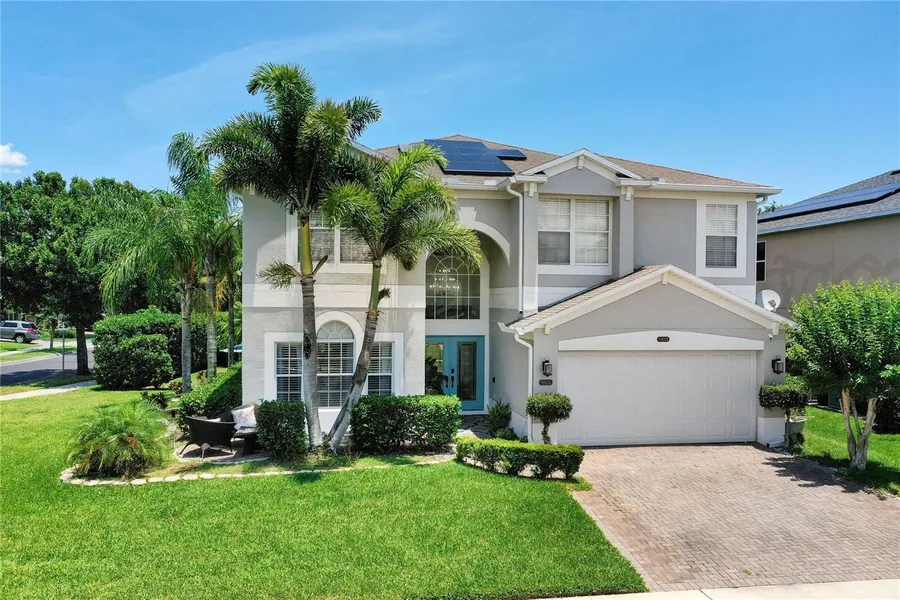 Stunning 5br/3ba two-story, located in one of Central Florida's most popular areas. An impeccable top to bottom remodel was recently completed with too many upgrades to list. But to name a few, the open floor plan showcases high gloss porcelain floors on the first floor, a built-in cedar bar, quiet walk laminate flooring upstairs, walnut shelves in almost every room, new doors, and custom built-in lighted closets throughout. Amazing gourmet copper kitchen, crystal chandeliers, new appliances, highly energy-efficient LED lighting, IT server/entertainment center room, dimmer light switches, and new GFI's. Wired Ethernet ports in all bedrooms. There are built-in ceiling speakers in almost every room, including outside. The Master bathroom includes heated LED mirrors, push-button vanities, and a two-person massaging hot tub. Large floor-to-ceiling tile, large walk-in shower with bench, multiple shower heads, and high pressure 20" rain style shower head. All of the toilets have been replaced with luxury bidets in two of the three bathrooms. There are also motion-activated lights in all service rooms and sensor-activated exterior lights, and the landscaping has been upgraded with multiple palms, hedges, and garden areas. In addition, a state-of-the-art solar system is proven to reduce the utility bills, and four exterior ring cameras are covering the perimeter of the house. The garage motor, door locks, security system, monitored smoke detector, and thermostats are all new and are Bluetooth/Wi-Fi enabled. All combined, this is an ultra-convenient smart home. High-speed gigabit internet is also available at this location. In addition, pest control pipes in the walls technology allow treatment to be done without entering the home. Prime corner lot allows for plenty of parking and is the 2nd or 3rd largest lot in the neighborhood with paved front and back patios and expanded driveway. Moss Park Ridge is a quiet and friendly community where you can walk or bike ride to the elementary and middle schools. The high school is also top-notch. In addition, this property provides easy access to 417, 528, and an incredibly short commute to Orlando International Airport, Lake Nona, Moss Park, Lake Hart, Nemours Children's Hospital, VA hospital, UCF and Valencia College, USTA, numerous golf courses, local shops, dining, and just 30 minutes to the beach or Amusement Parks! This is a must-see and will not last long.
