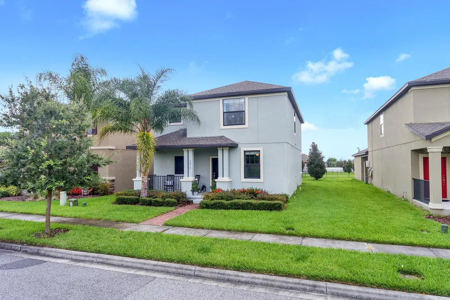 The best of Summerlake living! Set on a premium lot, this 3 bed, 2.5 bath home faces community green space, offering gorgeous sunset views every night from the covered front porch. And after the sun sets, catch a view of Disney fireworks from the back owner's suite window. Just 300 yards away from Summerlake Elementary, this home's location is one of the best you'll find in the neighborhood. The floorplan of this Lennar-built home is one of the most efficient available for maximized living space indoors, with practically every square foot utilized. It features arched interior doorways and a modern, yet neutral color scheme with granite countertops throughout along with brick-set ceramic tile. Homeowners have also made several upgrades in closets, garage, and attic space to maximize storage space. The lower level floor plan provides a spacious feel with 9-ft ceilings while still keeping the formality of designated living spaces between the foyer, front room, kitchen, and casual living space. The front room offers flexibility to be used as a formal living room, formal dining room, den, or play room. The kitchen features granite countertops, stained wood cabinets, custom tile backsplash, gas stove, and counter-height bar with space for up to 4 bar stools. The detached garage provides for ample yard space off of the back covered patio and plenty of natural light through large back windows. The upstairs owner's suite features dual walk-in closets with custom shelving and hanging upgrades as well as a spacious soaking tub and separate water closet. The second and third bedrooms share a jack-and-jill bathroom with dual sinks and a tub/shower combo with tile surround. The tech loft just off of the three upstairs bedrooms offers additional flex space that can be used as office space, play space, or gym space. Summerlake is one of the most highly sought-after neighborhoods in the Horizon West area, providing a beautiful community pool, clubhouse, gym, walking and biking trails, tennis courts, fishing dock, and more. HOA fee includes all lawn care and yard maintenance for front and back yards.