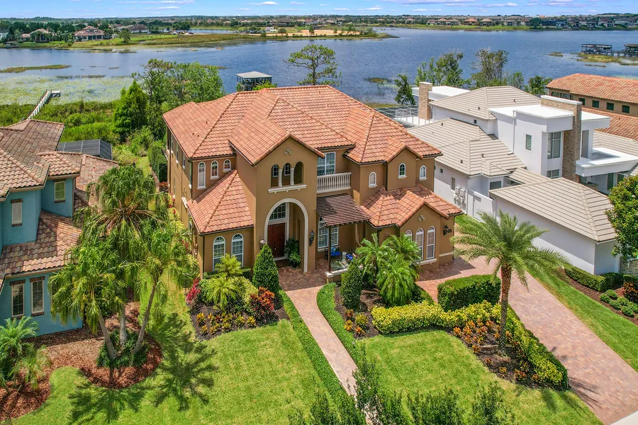 Disney fans, imagine watching the fireworks from your porch, pool, or covered boat dock! Only 15 minutes from the Magic Kingdom, this custom home boasts a rear lake view and front pond view and has all that the Orlando lifestyle can offer! Located in Horizon West with easy access to shopping, restaurants, and highly rated schools. Upon entering, you are met with the grandeur of the beautiful wood staircase, and stunning coffered and tray ceilings. Convenience reigns with double primary bedrooms, double laundry rooms, and an upstairs kitchenette. Entertaining is a breeze in the gourmet kitchen featuring Thermador appliances including a 36-inch dual fuel range, a 30-inch electric oven, and a convection microwave! The pass-through breakfast window makes it easy to enjoy your beautiful outdoor kitchen and generous screened lanai. Feel like you are on vacation year round when you are swimming in the heated saltwater pool or relaxing in the spa and enjoying the lovely view of 475-acre Lake Hancock. Your covered dock easily accommodates two jet skis or a boat and has water and electricity. Come inside and make memories in the huge loft or relax and grab a snack from the kitchenette for a movie in your own theatre complete with SI Black Diamond screen and MartinLogan speakers. The view from the multipurpose room is stunning and can be used as another bedroom. It has an additional attached room with sewing machines and with built-in closet space and room for a bed. This well-maintained home has a lightning protection system, A-NIKS™ mosquito misting system and so much more! Neighborhood amenities include a community pool, gym, tennis courts, and a clubhouse with regular events. Please contact me for a complete list of features.