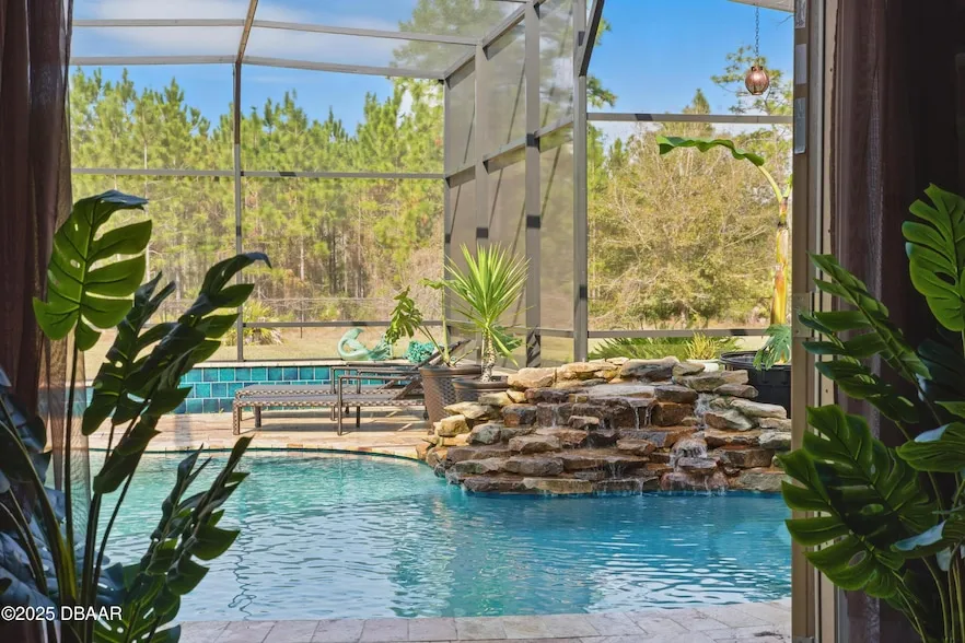 One or more photo(s) have been enhanced or virtually staged. Welcome to the Cape Orlando Estates of Wedgefield in East Orlando! Experience the best of both worlds serene country living with city conveniences in this stunning Isabel III model home, nestled on 1.24 acres of pristine land in the sought-after Wedgefield community. Built in 2013 and updated with a BRAND NEW ROOF in 2024, this move-in-ready retreat offers 4 bedrooms, 2.5 baths, and a 2-car garage, blending elegance with modern comfort. As you arrive, a long, inviting driveway leads you to this beautiful estate. Step through the grand foyer, where your gaze is immediately drawn through French doors to the sparkling pool oasis - a breathtaking first impression with its elegant Travertine pavers and stunning natural rock waterfall. Inside, rich dark wood laminate flooring flows seamlessly throughout, with tile in the kitchens and bathrooms for a perfect balance of warmth and practicality. The property is fully enclosed with a powder coated, chain-link fence on three sides and stately wrought iron fence with dual gates framing the entry. Designed for both comfort and functionality, this open-concept floor plan centers around the gourmet kitchen, which boasts granite countertops, stainless steel appliances, a spacious peninsula bar with seating, a closet pantry, and a charming eat-in breakfast nook. This kitchen is further enhanced by a brand-new 2024 smart refrigerator, adding both convenience and modern sophistication. The family room effortlessly connects to the kitchen and dining areas, creating a seamless flow that is ideal for both everyday living and entertaining. The split-bedroom layout offers privacy for all, with the master suite featuring a large walk-in closet and a spa-like ensuite bath with dual sinks, a garden tub, and a standup shower. Two additional bedrooms are situated at the front of the home, while a guest bedroom is tucked away at the back for added privacy and a soothing view of the rock waterfall. The backyard is a true paradise, offering 1.24 acres of open space a blank canvas for outdoor living, whether you dream of creating a garden, play area, or entertainment space. The screened-in pool and lanai provide the perfect retreat for relaxation. Plus, with a 120-gallon Pure Touch water filtration system, you'll enjoy pure, high-quality water throughout the home. The optional HOA and no water bill allow for flexibility and cost savings. Situated in a top-rated school district, this home is just 30 minutes from Cocoa Beach, a short drive from Orlando's world-famous theme parks, and offers quick access to major highways (528, 520 and 50), making commuting effortless. Within the community, Wedgefield Golf Club has matured into a Central Florida favorite. The Wedge Bar and Grill is a relaxed environment with food and cocktails after enjoying the course. Thoughtfully updated with elegant features and set on an expansive private lot, this home is truly a must-see, must-have. Schedule your private tour today and experience the elegance, space, and tranquility this incredible property has to offer!