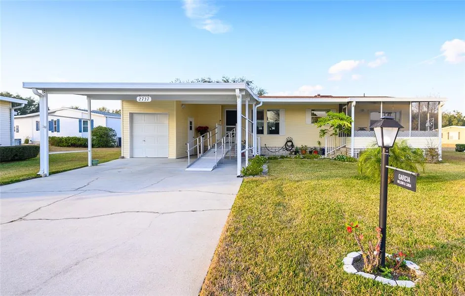 Under contract-accepting backup offers. Your home, your haven, your community. Welcome to Zellwood Station! Central Florida's Premier 55+ resident owned, gated, golf course, lake access, and resort style community with all the amenities and activities to enjoy! Spacious Palm Harbor Vegas Model. A split plan layout with a total of three bedrooms, two full bathrooms, living room dining room convo, inside laundry, eat in kitchen and a screened in porch. The double carport provides space for multiple cars plus your new golf cart, with an attached utility room that could make a great workshop. Custom built aluminum access ramp included. Recent upgrades include new roof in 2023, guest bath fully renovated and new tile in master bath. Zellwood Station is located approximately 30 miles from downtown Orlando and just 3 miles from the 429 Expressway. The expressway gives us quick and easy access to downtown, the Orlando International airport, the Disney area attractions, plus much more. A quiet area, tucked-into the rolling hills of Northwest Orange County convenient to Apopka and Mt Dora. Each of these towns offer everything from great shopping, to medical facilities, to churches and much more. (Seller will contribute $4,980 towards closing to help with first year of HOA fees) HOA per month includes: (100 megabit/sec) internet access with WiFi and two TV hookups, mowing, edging and blowing off of driveway, trash and yard waste pickup, and complimentary boat and RV storage (based on availability). In addition to 24 hour security with guard gate access, various amenities and an onsite restaurant. Don't delay on this adorable home priced to sell!