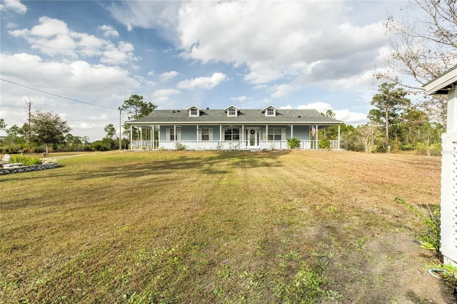 Located in the desirable Rocket City community in Wedgefield, this spacious 4-bedroom, 2-bath 1-story, single-family home set on a beautiful estate lot totaling nearly 6 acres, comprised of three (3) parcels. The main homesite includes 2.93 acres and is being sold with two additional parcels: 25-23-32-9632-00-230 (1.22 acres) and 25-23-32-9632-00-263 (1.71 acres) with two parcels vacant, offering exceptional flexibility for future use or investment. Horses are allowed, making this an ideal property for those seeking a true country lifestyle with room to roam. A beautiful wrap-around porch welcomes you home and provides the perfect place to relax and enjoy the peaceful surroundings. Inside, the home offers a split floor plan, formal living and dining rooms, and wood laminate flooring throughout, with one bedroom perfectly suited as a home office or flex space. Recent improvements include a new roof (2017), new A/C (2019), hurricane shutters (2019), septic system cleaned in 2022, and a new water heater (2025). The property also features a storage building on the main parcel and a dry pond, enhancing functionality and drainage.