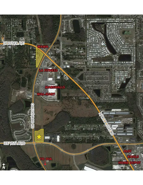 South Orlando, north of Lake Nona/Medical City and one mile north of Orlando International Airport which welcomed approx. 31.7 million air passengers in 2013. Located at NE corner of Goldenrod Rd and Lee Vista Blvd.