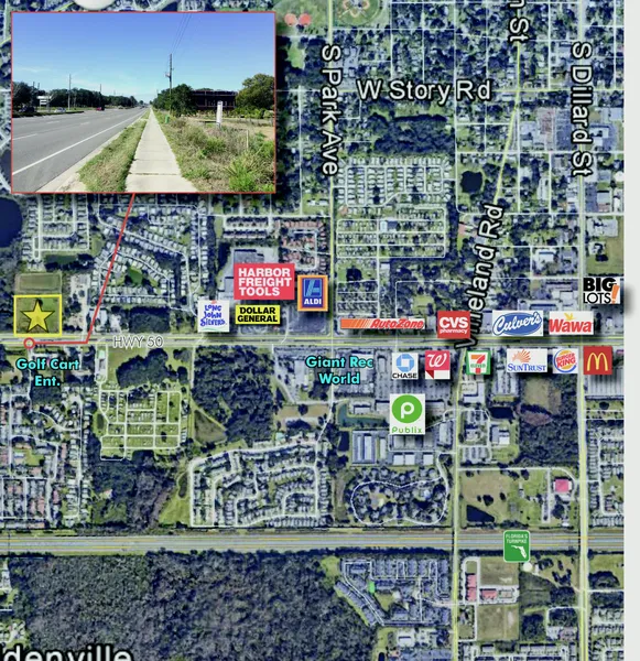 Prime development opportunity located on high-visibility Highway 50 in Winter Garden, Florida. Just east of a Florida Turnpike entrance and 6 miles west of SR 429, this property allows easy access to central Florida cities and theme parks. One mile east of the new 258-acre Oakland Park master planned residential community, which will increase demand for commercial uses in the subject market.
