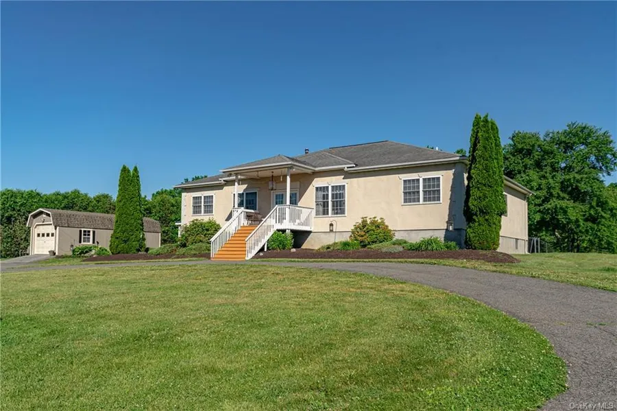 Unique, 2552 sq. ft. contemporary custom stucco ranch with dramatic open split bedroom floor plan, set back on 3.6 level, parklike acres, with a flowering pear tree lined circular drive a 2 tier deck and above ground pool to relax and entertain. Approx. 1500 sq. ft. finished walkout basement for additional space. Enjoy soaring ceilings, rounded walls, central air, ceramic tile, hardwood & pergo floors, 3 sets of French doors & windows galore. Prepare great culinary delights in a designer kitchen with large center island, stainless steel range and refrigerator. Spacious maser bedroom with private master bath, his & hers closet. Sit on your front porch and watch the sunrise & hear the sounds of birds. Close to restaurants, village shopping, golf and parks in the town of Montgomery.Why wait for the ease of one level living!