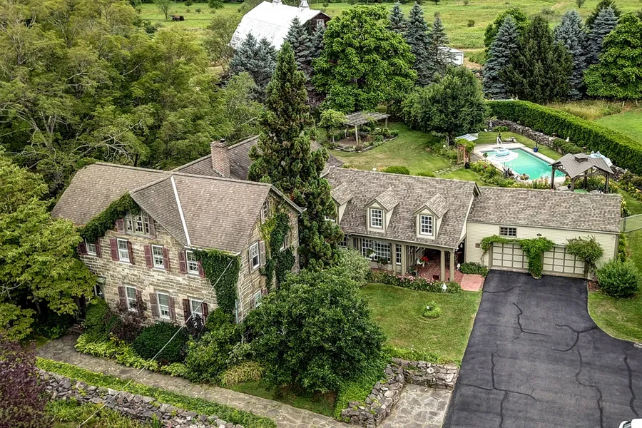 This historic stone home is an extraordinary blend of timeless elegance and modern convenience. Every detail is designed to inspire and delight. Built in 1791 by Jacob Mills, it was occupied by his descendants until the 1980s. “The Manor” invites you into the foyer through the breezeway. Pause as you enter the kitchen and take in the vaulted ceilings and shaker-style cabinets. Follow the open concept into the family room. The craftsmanship in all rooms is unmatched, highlighted by features like pocket doors that blend spaces seamlessly, built-ins that add functional charm, and window paneling that frames picturesque views of the lush surroundings. The main bedroom, bathed in light, provides a peaceful escape. All bedrooms are generously sized and offer plenty of storage. The screened flagstone porch is perfect for enjoying your morning coffee. The beautifully maintained gardens surrounding the in-ground pool create a picturesque backdrop for summer gatherings.