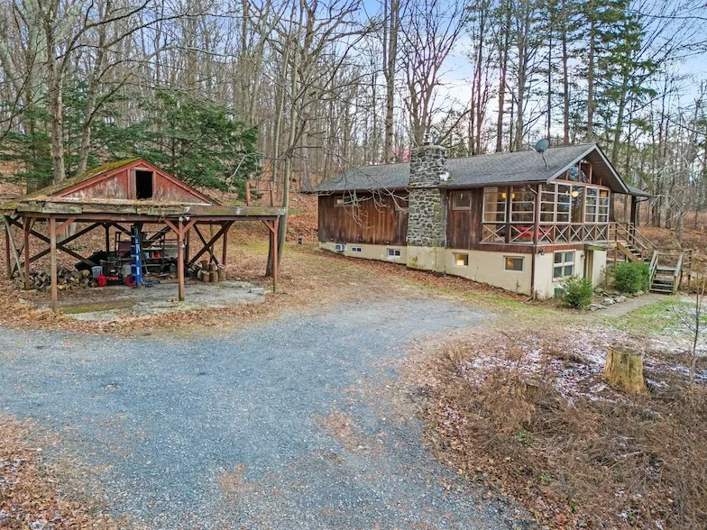 Cozy Cabin on 4.9 Acres! Discover your perfect retreat with this charming cabin tucked away on 4.9 picturesque acres in the Washingtonville School District. Whether you re seeking a peaceful getaway or a full-time residence, this property offers unmatched privacy and tranquility, all while being conveniently close to town and just an hour from NYC. The main level boasts an incredible sunroom with walls of windows, offering breathtaking views of the surrounding property. Step inside to an amazing living room with cathedral ceilings, a wood-burning fireplace, and floor-to-ceiling windows that bring the outdoors in. The level continues with an open eat-in kitchen, two bedrooms, and a full bathroom. The walk-out lower level has been thoughtfully renovated and features a possible third bedroom, full bathroom, and a spacious living area, perfect for a home office, game room, home gym, or guest suite. Additional highlights include a two-car carport and a brand new well pump and water filtration system. For those who love water, enjoy easy creek access right across the street. This one-of-a-kind property combines the best of both worlds peaceful seclusion and proximity to local amenities. Close to nearby hiking trails, farms, Storm King Art Center, Lego Land, and Woodbury Commons Outlets! Don't miss your chance to own this idyllic Hudson Valley gem!