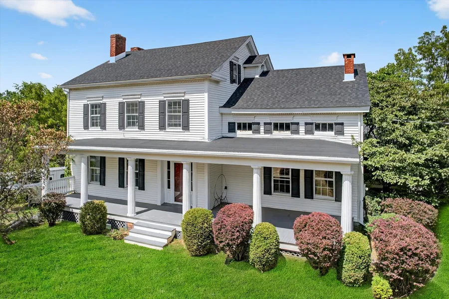 The main house retains all the hallmarks of its era — wide plank pine floors, tall classic windows, and perfect proportions. A sweeping, floor-through living room with a large picture window offers stunning views of the property. Grand front and back staircases, a deep front porch with elegant Roman columns, and beautifully preserved architectural details make this home both stately and welcoming. A private side apartment with a separate entrance features two bedrooms, two bathrooms, and its own original wide plank flooring — ideal for guests, extended family, or rental income.