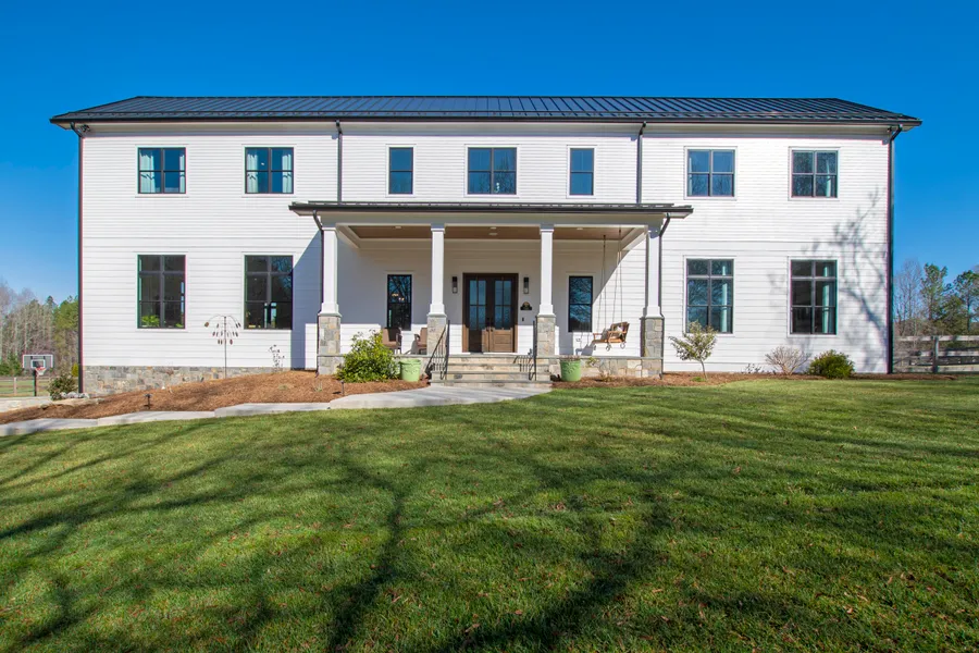 This stunning and private modern farmhouse sits on 5 pastoral acres and is within walking distance from McDougle schools. The striking front elevation is dressed with white board and batten siding, a black metal roof, large front windows, and a natural stone faced front porch. As you enter through the front door, the clean-lined and fresh harmonious design elements continue throughout. The open living room boasts an electric linear fireplace that sits on an impressive 14 ft high fireplace surround. Just steps from the living room is the extraordinary designer kitchen that features two expansive kitchen islands, perfect for entertaining and large gatherings. Contemporary lighting and hardware selections complement the traditional farmhouse details that were carefully curated to create this stunning blend of materials.