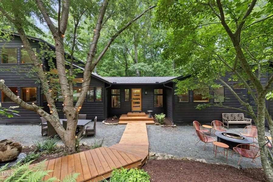 **Back on the market with multiple significant updates!** This home now features a brand-new roof (not just repaired), offering long-term durability and peace of mind for the next owner. A designated NC Modernist gem on 4 private acres in the heart of Chapel Hill. This artisan-crafted home is a rare blend of architecture, light, and landscape-surrounded by mature forest and curated gardens. The open-concept layout is ideal for entertaining, anchored by a thoughtfully designed cook's kitchen with multiple work zones. A stunning home office or creative studio offers the ultimate live/work flexibility. Upstairs guest suite with separate entrance and full bath provides privacy for visitors. Every inch of this home is filled with thoughtful, artistic detail and bathed in light. Be sure to view the full photo gallery and video tour-this one is truly a rare find.