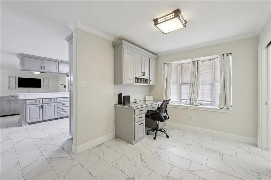 This beauty in Bridge City offers an abundance of desirable features! The home has been thoughtfully updated throughout, showcasing an open-concept design that seamlessly integrates the den, kitchen, and dining area. Additionally, it includes a separate living room &breakfast room, all with elegant tile flooring. The kitchen is equipped with a stainless-steel appliances, a pantry, quartz countertops, and a breakfast bar. The dining room is spacious, perfect for entertaining or hosting large gatherings, and features built-in shelves &cabinetry for added convenience. The primary suite offers an en-suite bathroom & a walk-in closet, ensuring a private retreat. For added convenience, there is an interior utility room. The sunroom provides a picturesque view of the expansive in-ground pool and generous yard, which offers rear access and ample space for the addition of a workshop or the conversion of the existing storage shed.