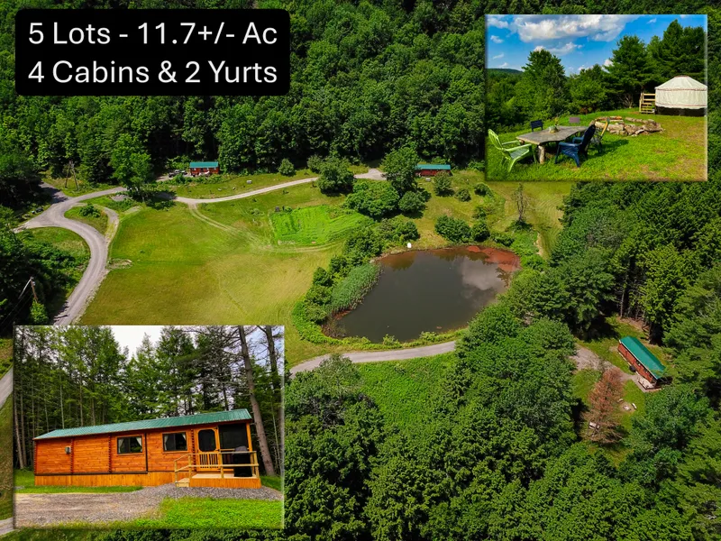 High earning Airbnb investment village! These 5 lots totaling 11.7 +/- acres, located in the beautiful mountains of South Randolph, VT, just minutes from VT I-89. There are four lots, each with their own log cabin park model home, a fifth lot with a fantastic Yurt and quant bath house. Additionally, there is a second Yurt that can be moved by the purchaser to a fully prepped area with water/sewer and power. One lot is over 5 acres and includes an open grassy field, pond and garden area making for a wonderful community Airbnb experience. Gross income for the development was (2023 - $125,746 and 2024 $116,914). Recent changes include the addition of a new Cabin and conversion of a second to Airbnb starting August. Based on past numbers, this should provide a future yearly gross income of approx. $169,000. Future potential with three additional bedrooms of unused septic capacity is alread...