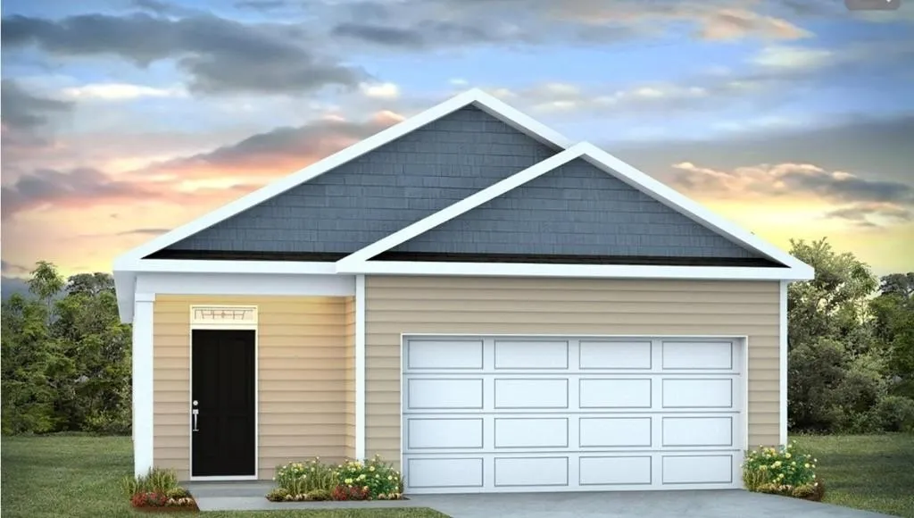 The DOWNING floorplan features a large kitchen, living, dining space, leading to the primary at the rear of the house. This private retreat features a walk-in shower and spacious walk-in closet. Right off the living room are the 2 guest bedrooms that share a full bath. The covered patio allows for a perfect place to enjoy a sunset or just enjoy your brand-new home! Photos are a depiction of a similar home.