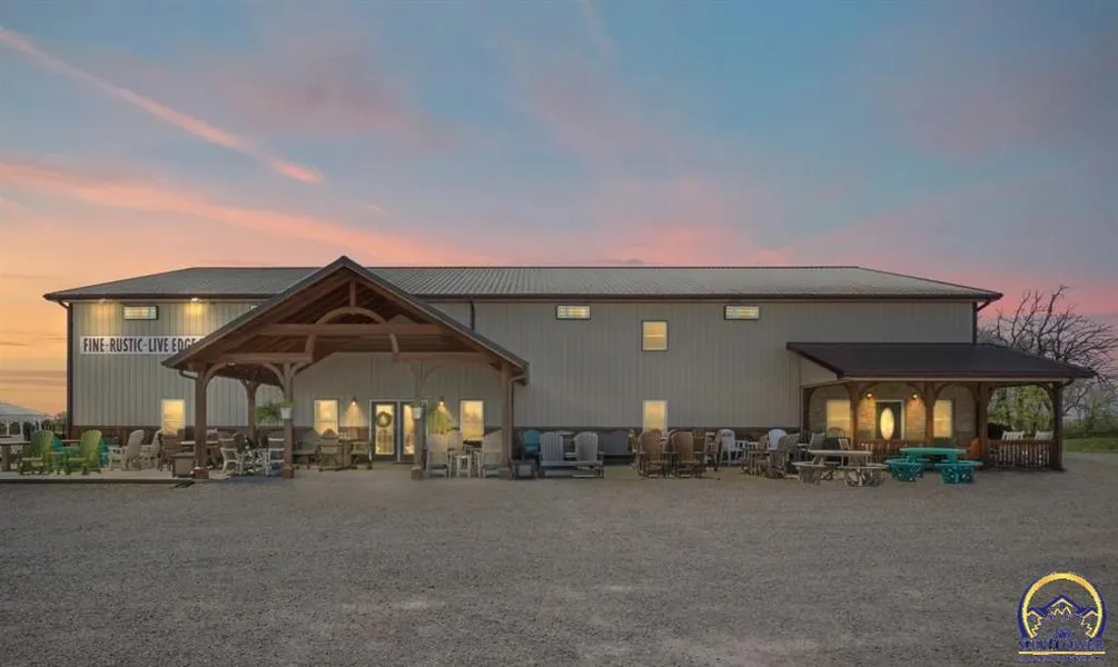 NEW PRICE! All in one dream property located on blacktop with 14.56 acres and Hwy 75 road frontage between Lyndon and Topeka. 80' x 100' metal building constructed in 2008 offers over 7400 sq ft finished. Residence is located on the far north end featuring 2 story, 5 bedrooms, 2fullbathrooms, 1 half bath, single car attached garage, private back patio, storage shed. Enjoy country setting under covered porch with brick and stone patio pavers. Fruit trees, grapevines, pond and walking trails. Timbered draw with creek running along the west edge of property. Front covered patio invites you into breathtaking showroom consisting of 4800 sq ft finished between the main and upper levels. Rustic wooden beams and posts give this showroom quite a reputation! Workshop is located on main level on the west side and consists of 3800 sq ft. including 20' x 24' private workshop on the upper level. Large parking lot is well kept with positive drainage. Endless opportunity awaits the new buyer- wedding venue, Airbnb, dance studio, high end steak house and brewery, private school, woodworking business, fitness center. BIG DREAMS can come true! Schedule your private tour. No Sunday showings please. Most know this facility as South Wind Gazebo and Uneak Wood furniture store. Real estate sells without business name or inventory. Traffic count per KDOT 5,000-7,500/daily average.