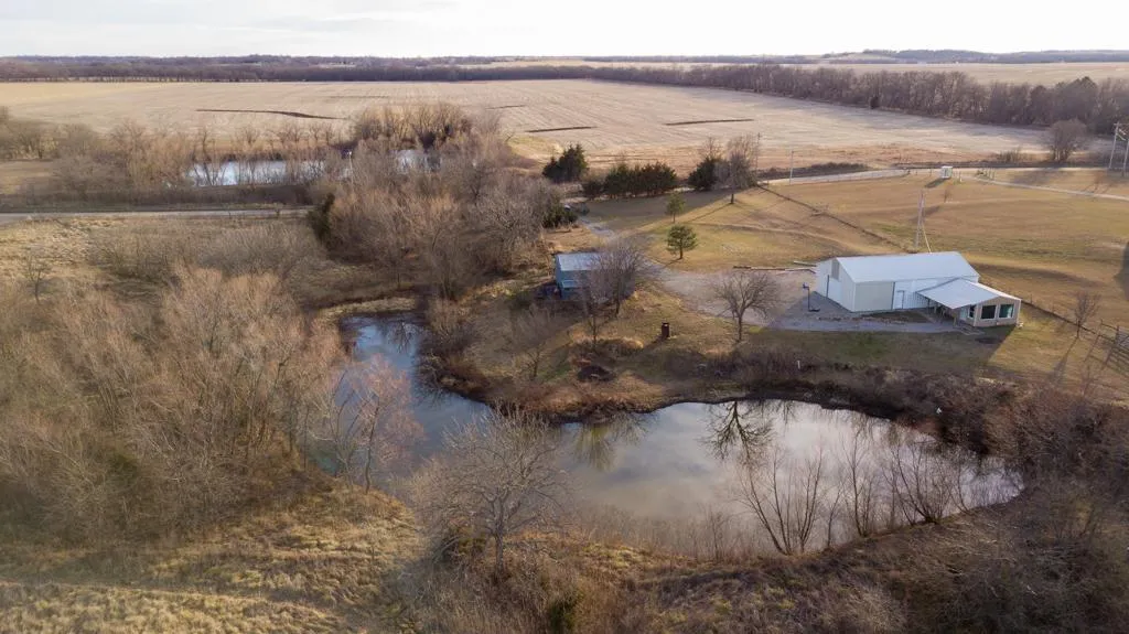This newly updated shop house is located just outside of Carbondale on 7 +/- acres. It offers peaceful country living with a large pond right outside the front door. The 1,240 square foot living quarters was recently remodeled from top to bottom and consists of 2 bedrooms and 1 bathroom. The kitchen/dining/living area has an open floor plan with a breakfast bar and large bay windows. The main floor bedroom has a large, walk-in closet. The living area is heated with electric floor heaters and cooled through the wall air conditioners. The upstairs has a finished loft bedroom. The attached shop has a concrete floor with lights and electric run throughout and two large overhead doors. There is also a detached storage shed with electricity and a water spigot. The pond is stocked with a variety of fish. There is some fencing throughout the property to allow for livestock grazing. For additional information, disclosures, or to schedule a showing, contact Trent Siegle at (620) 767-2926.
