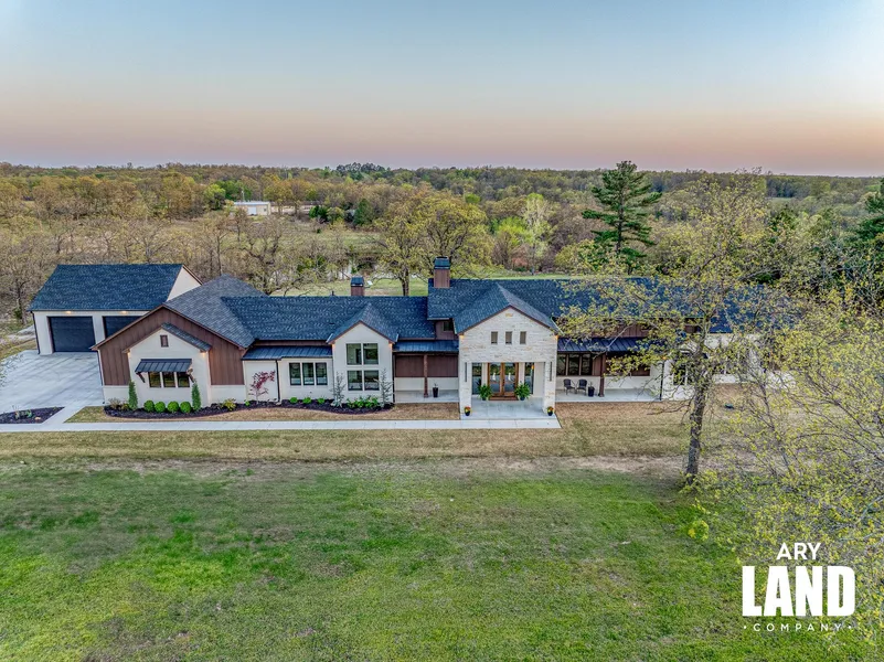 LUXURY HILL COUNTRY CUSTOM ESTATE ON 5 +/- ACRES WITH LARGE POND AND SHOP IN SKIATOOK. Set on 5 +/- acres with mature trees and large pond, this 3,694 sqft one-of-a-kind, single-level estate combines Texas Hill Country architecture with smart, high-end design. The property includes professional landscaping, 3-car garage, 33'x30' detached shop, and great mix of treed and cleared land. Interior features 4 private en-suite bedrooms, 2 additional half baths, dedicated office/flex room, dual laundry stations, and 1,000 sqft walk-out attic space. Throughout the home, you'll find real hardwood floors, imported Saltillo tile, custom cabinetry, lighting, and 10'+ ceilings with 8' doors. The grand living room showcases 21' vaulted ceiling with wood beams, two-story Austin stone fireplace, and 24' of full-view sliding doors that lead to 1,350 sqft covered patio space with wood-burning fireplace. The kitchen is equipped with a 5'x10' handcrafted black walnut epoxy island, built-in refrigerator and freezer, double ovens, double dishwashers, induction cooktop, and pot filler. A secondary Butler's pantry adds built-in Miele espresso machine, drawer microwave, beverage cooler, and additional pantry/prep space. The primary suite includes 12' ceilings with wood beams, Austin stone fireplace, Saltillo tile walk-in shower, freestanding soaking tub, dual vanities, and a large walk-in closet. Additional upgrades include spray foam insulation, Pella Impervia casement windows and doors, 3 HVAC units, 2 tankless water heaters, generator-ready infrastructure, and an EV charging station. The detached shop offers flexibility for equipment, storage, or hobby use. Located just minutes from Skiatook Lake, this property offers quick access to boating, fishing, swimming, and hikingalong with small-town charm and community events. Whether you're looking for a primary residence or weekend retreat, this home offers a rare combination of land, design, and everyday functionality thats hard to find.