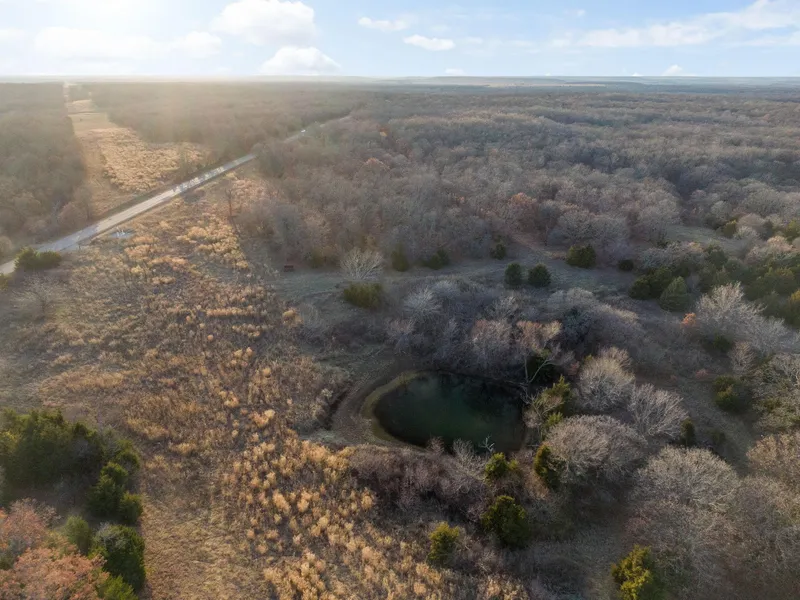 As you drive through the western edge of this property you will notice a mix of hardwood timber with an open canopy and little to no briars at all. It’s also comprised with scattered cedar trees and switch grass planted throughout. The property has a draw that funnels into the middle making for some good elevation changes ranging from 850 feet in the bottom to around 930 feet on the eastern edge. The bottom has a natural drainage ditch and a presumed natural spring with crystal clear water in pockets throughout. There is a pond on the southern edge of the property that is also crystal clear and still holding plenty of water. Just above the pond on the western side would be an ideal build site overlooking the Osage County bottom ground!