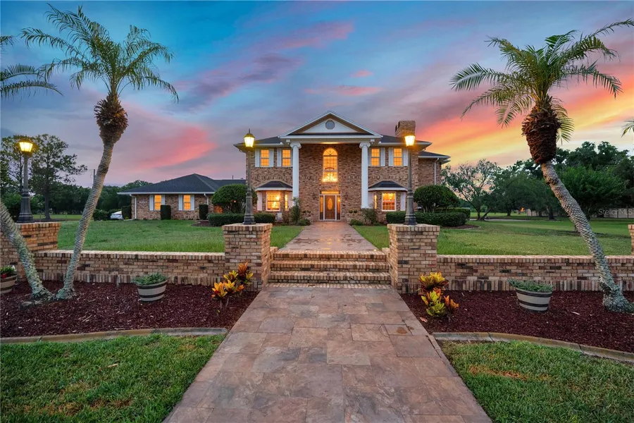 Welcome to this Custom-built two story Colonial style home, in the heart of Central Florida. Two Doric columns make for a grand arrival, welcoming you, family and friends as you enter into the spacious layout of this home, situated on 2.72 acres. The Colonial design is stunningly created with custom manufactured Old Chicago Wood Burn brick on all exterior walls and planters, giving a timeless and maintenance free exterior. This spectacular home features 3,868 sq. ft. of total living area, while the home itself provides 5,439 sq. ft. This stunning home showcases an exquisite amount of detail and amenities throughout, complimented with the highest quality of materials. Intricately crafted moldings throughout the cabinetry, doors and trim, composed of walnut, oak and mahogany. As you enter the home your view is the vaulted ceiling along with a single run radius and open staircase, along with a spacious foyer. An open view of the formal dining room with beautiful hardwood flooring, accented with a tray ceiling and front bay window. The custom built-out, Study/Den is fit for the work at home professional needing privacy, for a home based business or even perfect as a homeschool room. The elegant marble fireplace is laced with intricate hand carved mahogany. Also complimented with a front view bay window. The elegant, yet sleek and functional kitchen has hand crafted walnut cabinetry, granite tops, and features plenty of counter and cabinet space, along with a large pantry. Adjoining the kitchen is an open dining area with a view through the French doors of the back porch and beautiful swimming pool. The formal living room is absolutely stunning with intricate details such as lighted tray ceiling, accented down lighting over the wood burning fireplace, gorgeous stone work, along with a Bay window area. A large recreational room provides plenty of space for informal gatherings, providing a view of the pool area and French doors to enter pool side. Also allows private exit to the front of home and the 3 car garage, which has extra wide and height doors. The rear of the home highlights a large covered porch area with cabinets, granite tops, built in gas cooktop, built in eating area, adjoined by the large pool. The entire area provides lots of room for fun and relaxation for family reunions, parties and entertaining friends. Upstairs you will find an elegant master suite, with a large walk in closet, a master bath with large shower and spa. 3 generous size bedrooms featured with plenty of closet space. A full size bath, along with the convenience of washer and dryer with easy access. This is the perfect home for you and your loved ones for generations to come. This elegant estate is classic, comfortable, and practical, providing for a great Florida lifestyle. The quality of construction cannot be overstated. Don't delay schedule a showing TODAY!