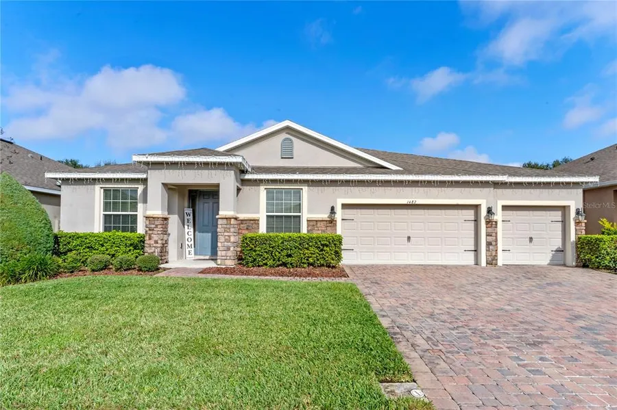 Gorgeous 5 bedroom, 3 bathroom single story home has it all! Open floor plan home features wide hallway ceramic tile throughout home and carpet in the bedrooms. Contemporary DREAM kitchen has Stainless steel kitchen appliances, gorgeous granite counter tops with unique backsplash, very large island perfect for entertaining accentuated by pendant lighting and walk-in pantry. The master bedroom has upgraded tray ceiling, plenty of light coming in from the windows and features master bath complete with stand-alone oversized shower, relaxing garden tub and dual sink vanities with access to large walk-in closet. Interior laundry room provides convenient access. The second bathroom also features dual sink vanities and cultured marble tops in all 3 bathrooms. Enjoy the evenings on the rear covered lanai. Outside features brick paver driveway for 3 car garage, beautiful exterior stone accents an...
