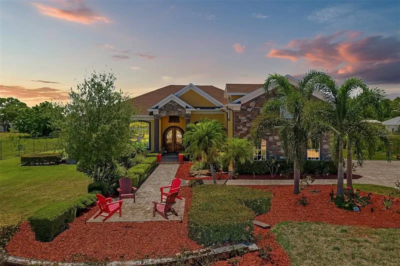 One or more photo(s) has been virtually staged. Welcome home! This extravagant contemporary home is located just minutes from Lake Nona, Disney World's future 60-acre campus, Lake Nona Medical City, Orlando International Airport, Eagle Creek golf course, great schools and more. This stunning one story turn key home sits on just under an acre of land at .93 acres and has 3 bedrooms, 4 full baths, with a bonus room that is located above the 3 car garage. The bonus room is currently the theater room (this room can be turned into a 1/1 studio apartment), an executive office, with hand crafted wood trim throughout and 3050 square feet of living space. The front exterior features a private gate that is controlled by remote or code, mature landscaping with bountiful fruit trees, stone facade, and over $50k in beautiful pavers throughout the entire exterior of the home where you will enjoy many fun weekends and get-togethers. This home is filled with tons of upgrades that you must see to appreciate. The home comes equipped with central vacuum in each room including the hallways. Throughout the home there is travertine flooring and also large windows letting light stream inside for natural illumination. Beautiful hand painted and signed murals give this home a very unique touch. As you enter, you will see the formal dining room and the formal living room with an amazing view of your pool patio. The gourmet kitchen has it all, Gas stove, bar seating, stainless steel appliances, 42" cabinets, and granite counter tops. Right off the kitchen is the living room that features Coffered ceilings and an electric brick fireplace. The primary suite is positioned on the left-wing of the home, giving you plenty of privacy, with its own sitting room that opens to the back patio. You will also find double walk-in closets, dual sink vanities, a jacuzzi tub, a separate tiled walk-in shower, and a water closet. On the right-wing of the home, you will find 2 more bedrooms with a jack & jill full bath and a small walk up to the theater room. The laundry room provides plenty of extra storage space and connects off the garage for convenience. This home is extremely energy efficient with 2 tankless water heaters and double pane windows that are tinted. The star of this home is the extra large covered patio that is covered in beautiful pavers and stone accents, has an outdoor kitchen, electric fireplace, and of course the breathtaking saltwater pool. Imagine the memories you will create in this space. Additional home features are located in the attachments. Don't miss this opportunity, schedule your appointment today!!!