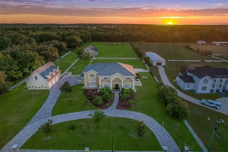 Welcome to this tranquil country estate. Beautifully renovated and meticulously maintained, this unique property is situated on almost three acres of land just minutes away from Walt Disney World. The home features six bedrooms in the main residence (three of which are ensuites), purpose built block three-plus car garage with climate controlled gym (34x9 feet long), one bedroom self-contained, private apartment above the garage, outdoor salt pool and covered patio, an 1809 sq feet - six stall barn fitted with tack room and feed room, and cinema quality 8 seat theater. Drive onto the paved circular drive way where you will find ample parking space. Enter through the beautiful custom front door, into the light filled foyer with soaring ceilings. To the left sits a formal living/reading room and on the right is a large office with its own entrance. Moving further into the home past the grand sweeping staircase and half bathroom, the kitchen awaits. This boasts an enormous island with built in storage, 42inch cabinets, subway and glass tiled backsplash, pot filler, whirlpool appliances, commercial grade Frigidaire fridge/freezer. To the left is the oversized family room, featuring recess lighting and surround sound perfect for family gatherings and game nights. The family room leads you to either the pool, or to the laundry room and powder bath with access to the pool area. Back to the right side of the kitchen, you can head towards the spacious dining room/sun room, the theater with 7:2 surround sound system which is complete with reclining seats, and 4800 lumen projector. There is also a downstairs bedroom with en-suite and large walk-in closet, featuring direct access to the pool via the en-suite. Heading upstairs you will find the large, elegantly appointed, primary bedroom. This room offers fireplace, sitting room, two walk-in closets, substantial balcony, and an enormous spa-like bathroom. Primary bath includes dual vanities, large shower with two separate controlled shower heads, and an oversized jetted tub. The additional three spacious upstairs bedrooms offer generous closet space. Two bedrooms share a Jack and Jill full bath, the other is yet another en-suite. The fifth bedroom is currently set up as a second home office. On the left side of the home sits the three car garage and apartment. The block garage was built in 2018, and easily fits three vehicles and offers vast storage space, with the gym on the back side. Up the separate stairs with a private entrance, the apartment was optimally designed, making the unit feel extremely spacious. Apartment highlights include: Granite counters, digital cook top, living room, separate bedroom, full bath and laundry room. Beyond the picket fence is the full size six stall barn with feed and tack rooms, and separate fenced in area for chickens. Lot was designed for animals health in mind and graded to drain into the existing pond. The homes open air salt water pool and outdoor shower are perfect for enjoying Florida's glorious weather. Recent updates include 2 new air-conditioning units (inside and out) 2021, new water filtration system and water softener - 2021, new stove and pot filler 2021, new pool heater and salt system 2021. Roof 2018, paint 2019, septic pumped 2022, new light fixtures, ceiling fans and hardware. Rental of the apartment could generate great residual income. Enjoy Florida living at it's finest!
