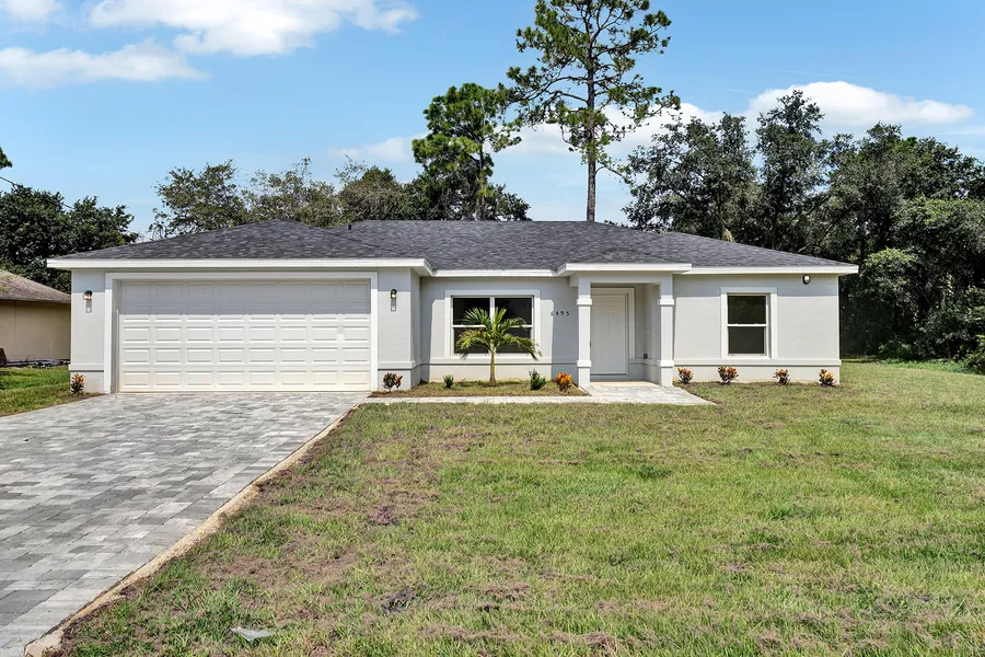 NEWLY BUILT in and finished in September 2022!! Welcome to the NO HOA and NO CDD neighborhood of New Eden in St. Cloud! Here you'll find an exquisite CUSTOM built 3 Bedroom, 2 Bath home for you to enjoy lots of privacy in this end of the slot with huge back yard and over 1/4 ACRE of land! Once you enter you are greeted by a large Great room with cathedral style HIGH CEILINGS and TILE FLOORING throughout the entire house. The kitchen includes all STAINLESS STEEL SAMSUNG appliances and a large island featuring GRANITE countertops and modern backsplash as well as a walk-in pantry. The Master bedroom overlooks the large backyard and the master bath is equipped with double vanity with granite countertops and access to a large walk-in closet. The oversized laundry room is also worth mentioning with utility sink, washer and dryer. Don't forget to bring your boat or Kayak! This home is located within 1000 feet of the Boat Ramp in the New Eden Community providing access to Lake Center on the The Alligator Chain which is a chain of 6 lakes that can be accessed through navigable canals; starting from the New Eden Boat Ramp you can access Lake Center, Coon Lake, Trout Lake, Lake Lizzie, Alligator Lake and Brick Lake. It is also located about 25 minutes from the Lake Nona/Medical City, 30 minutes to the airport and about 1 hour to the beaches!