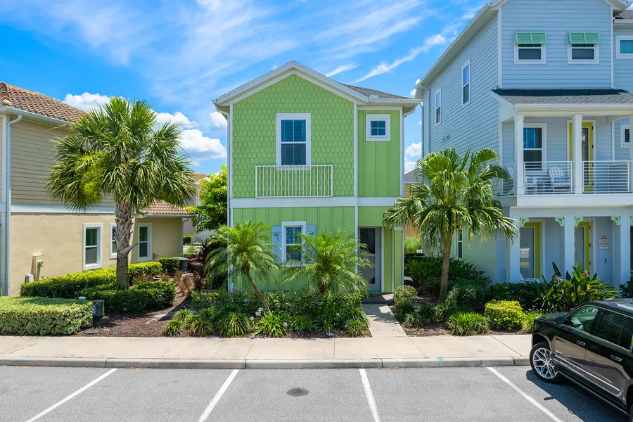 Margaritaville Orlando resort! This Key West-style three-bedroom cottage comes with three baths and an additional bunk room. Super cute with pastel tastefully designed colors. Primary bedroom with en-suite bath is downstairs with French door opening to the back yard with spacious paved patio. Two other bedrooms have en-suite baths and are upstairs along with additional bunk room. Cottage is fully furnished with City Furniture package, Jey West Sunset. All tile floors, ceiling fans, speaker system in the living room, fully equipped kitchen, TVs and artwork. Upgraded kitchen cabinets, quartz countertops and 10-foot ceilings. In the heart of Margaritaville just minutes from Disney. Enjoy famous Sunset Walk with many restaurants, shops, bars and live music. Water park and community gym, multiple pools, playground, kid's club and more. Short-term rental allowed is what makes this place a great investment, secondary vacation cottage or primary home.