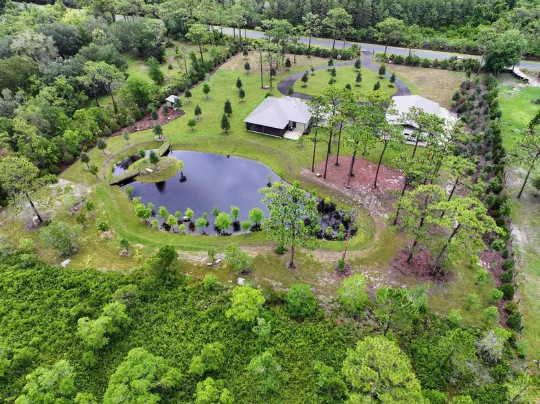 Custom-built CBS 2BR/2BA home on 5 acres with scenic pond, private island, waterfall, and land bridges. Finished with beetle-kill pine from the property, also featured in custom furniture. Designed for accessibility with accessible primary bath and deep soaking tub in guest bath. Triple sliding pocket doors offer stunning views. Granite countertops, knotty pine accents in kitchen and baths. Large utility room with dog wash. Includes 40x60 pole barn, 2 RV hookups, and room to expand. Over 300 trees provide privacy and a peaceful setting. Landscaped grounds attract local wildlife. No HOA, rural ag zoning, end of quiet road next to Wildlife Management Area. Close to the Orlando attractions and the Space Coast beaches.